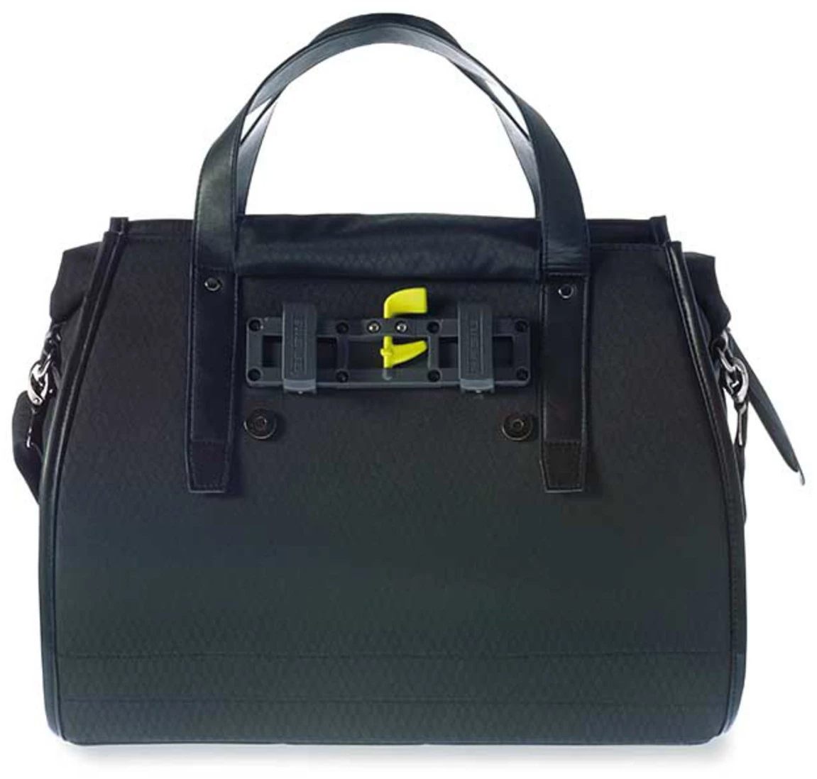 Hook the Basil Noir bicycle shoulder bag easily to the rack of your (electric) bike thanks to the handy Hook-On system. This allows you to take your pannier off the bike within seconds and carry it conveniently to the next point on your agenda. The green security clip prevents you from losing your pannier on the road. Because the weight of the bag is placed much lower, you cycle much more stable and therefore safer. Very nice! The hooks on the bag are neatly shielded so that you are not inconvenienced by the system while carrying it.