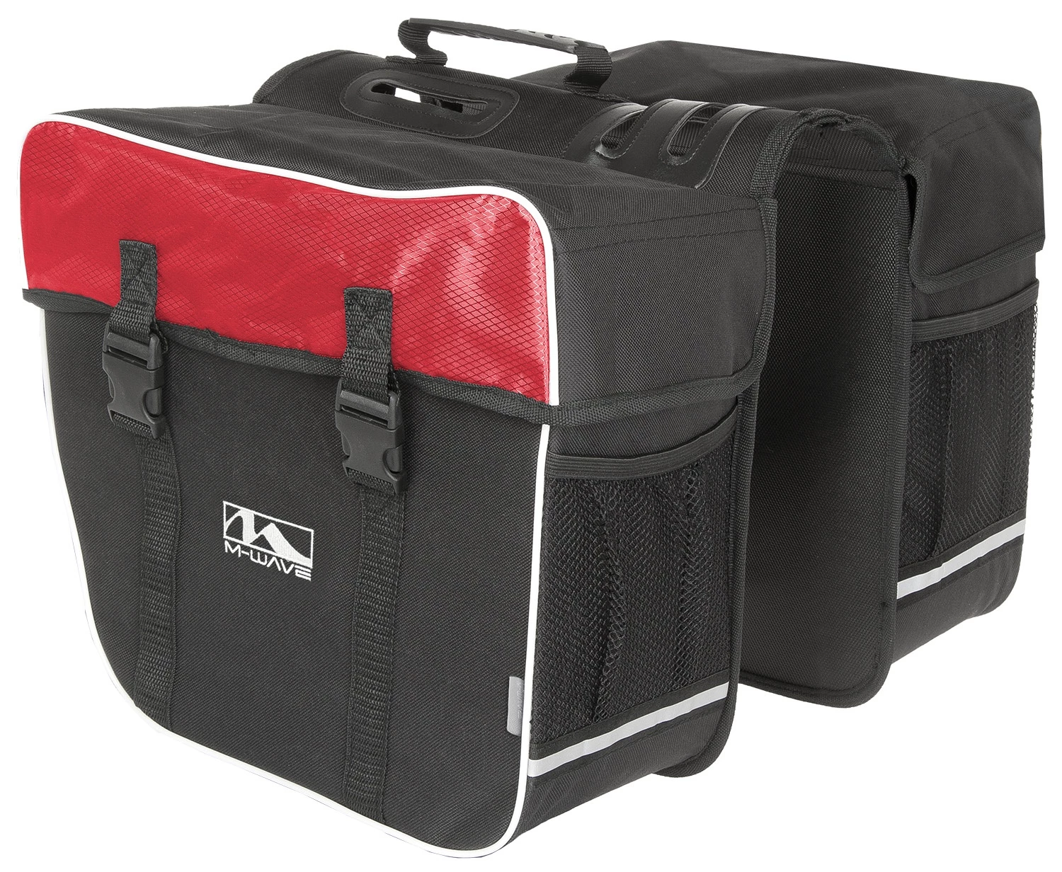 rear pannier bag “M-WAVE AMSTERDAM DOUBLE”, material: olyester 600 D, black/red, size: total width approx. 50 cm, bags: 34 x 17 x 30 cm (LxWxH), large main compartment with QR’s, through plastic sheet reinforced, with reflective tape and net at the back, handle between the bags, slots at the top for safe fixing at the rear carrier