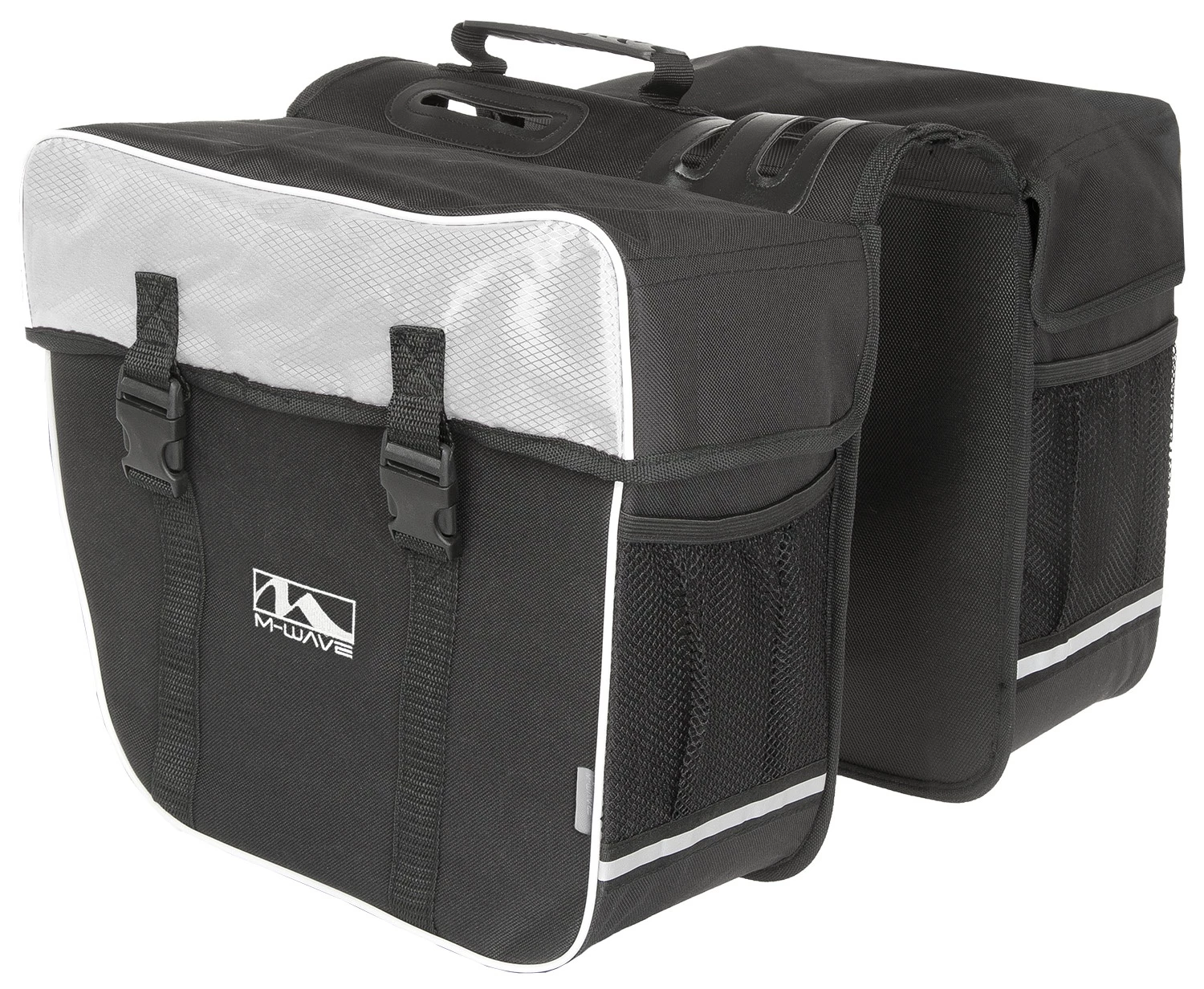 rear pannier bag “M-WAVE AMSTERDAM DOUBLE”, material: polyester 600 D, black/white, size: total width approx. 50 cm, bags: 34 x 17 x 30 cm (LxWxH), large main compartment with QR’s, through plastic sheet reinforced, with reflective tape and net at the back, handle between the bags, slots at the top for safe fixing at the rear carrier