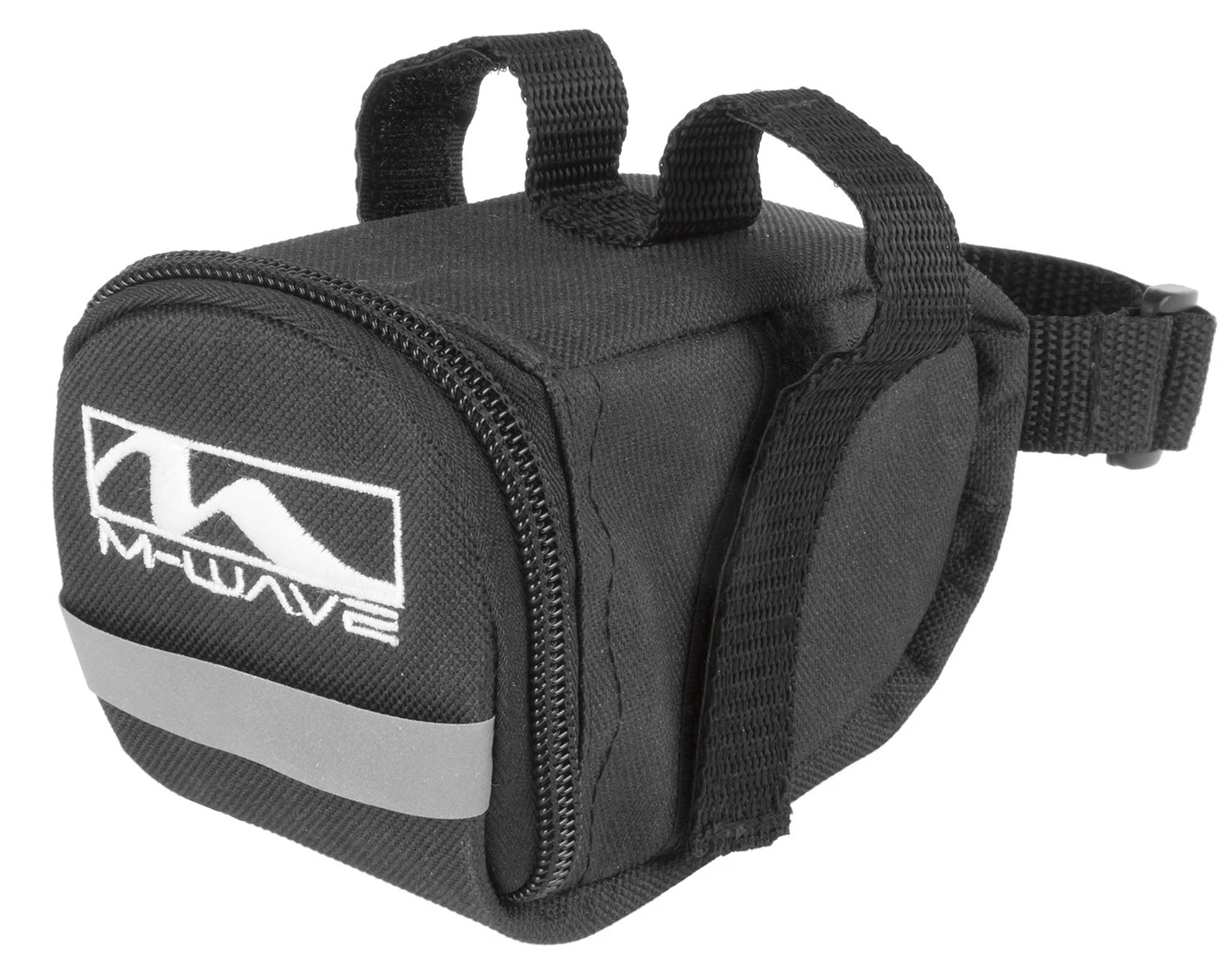 small saddle bag, fixation with 3 velcros, reflective tape at the sides, with zip and soft pads, for easy carrying the bike, with “M-WAVE BIKE & OUTDOOR” logo