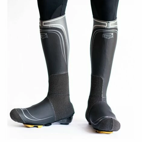 Spatz Pro overshoes have been developed by Olympians and Pro Cyclists. Engineered from the finest neoprene on the planet, these revolutionary knee length overshoes will transform your wet/cold riding experience. Intelligent water-dispersing thermal lining. Hydrophobic outer layer. Heat welded and taped seams. Stretch velcro fastener behind the cleat. Wrinkle-free cut.Â